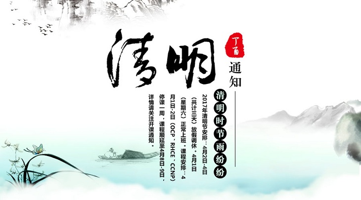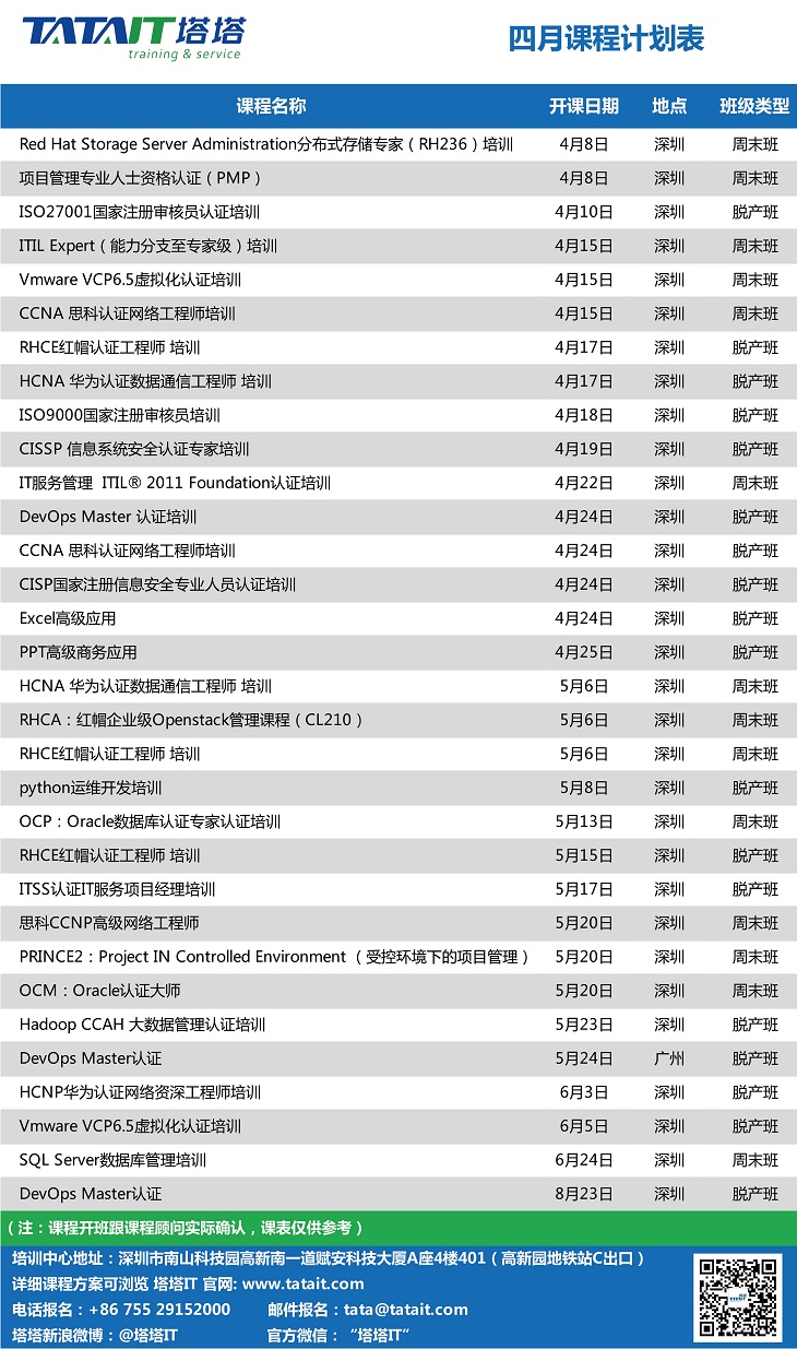 課程安排:4月1日-2日(OCP,RHCE,CCNP)停課一周,課程順延至4月8日-9日,詳情請關(guān)注開課通知。