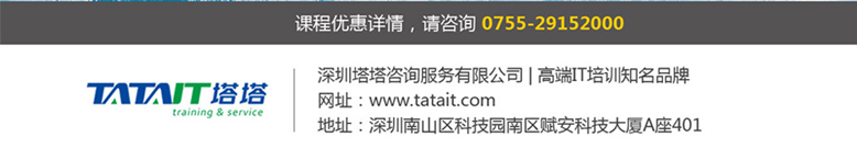 咨詢(xún)郵箱:tata@tatait.com 咨詢(xún)電話(huà):0755-29152000 新浪微博:@塔塔IT 微信:添加公眾賬號(hào)“塔塔IT”加關(guān)注!塔塔IT為邁瑞思旗下子品牌,專(zhuān)注高端IT培訓(xùn)。